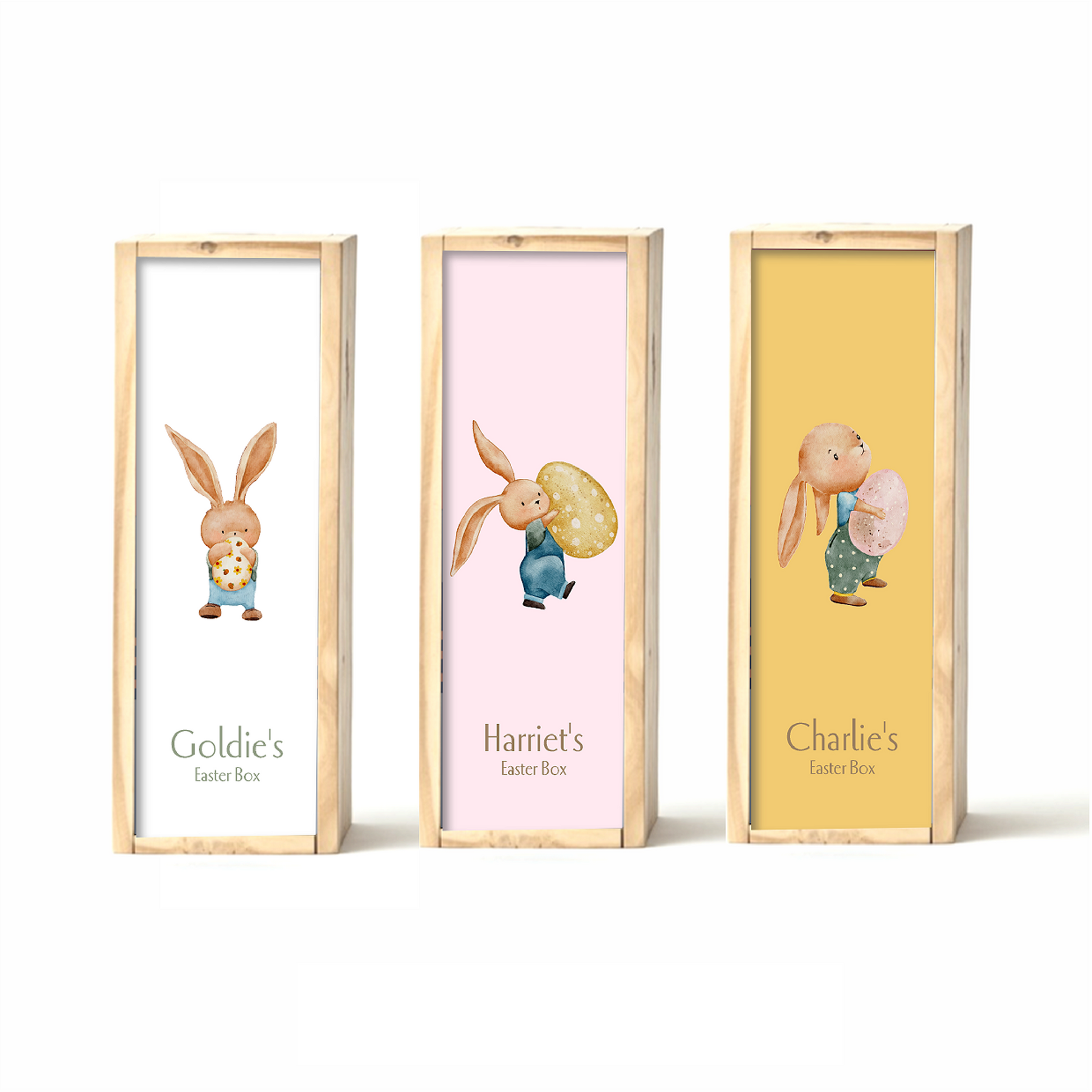 These personalised Easter Boxes are a fun place for the Easter Bunny to hide Easter Eggs. Size 36x15x15cm (think wine box). The kids will love them!!!!